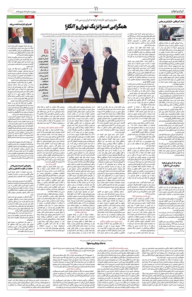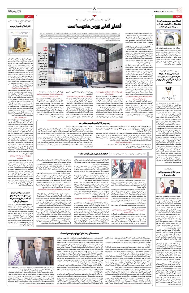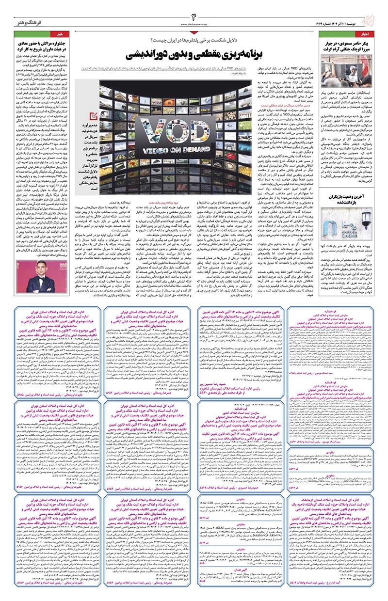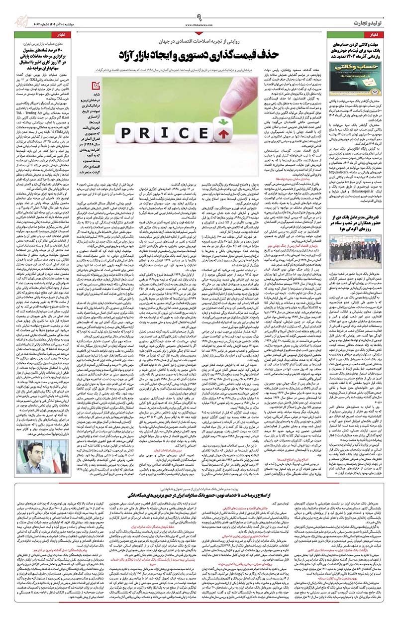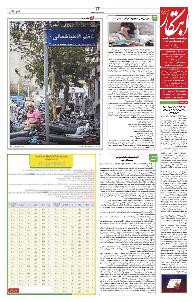 صفحه ۱۲ |  صفحه ۱۱ | ایران و جهان صفحه ۱۰ | آگهی صفحه ۹ | تولید و تجارت صفحه ۸ | بازار و سرمایه صفحه ۷ | ایران زمین صفحه ۶ | حوادث صفحه ۵ | جهان ورزش صفحه ۴ | فرهنگ و هنر صفحه ۳ | جامعه صفحه ۲ | سیاست روز صفحه ۱