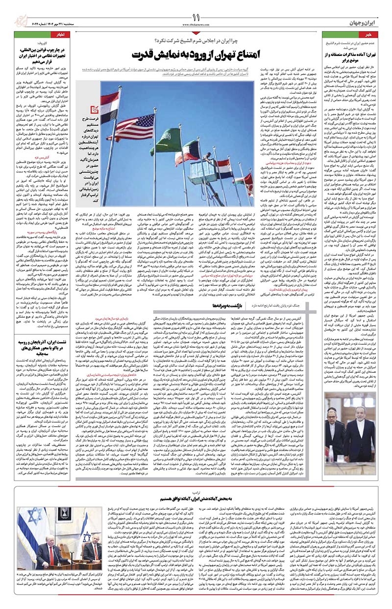 امتناع تهران از ورود به نمایش قدرت بازگشت به ویرانهها به محض آماده شدن ایران، آماده توافق هستیم در چارچوب قوانین بینالمللی، تجهیزات نظامی در اختیار ایران قرار میدهیم نشست ایران، آذربایجان و روسیه در باکو با محور همکاریهای سهجانبه تهران؛ آماده مذاکرات منصفانه و از موضع برابر