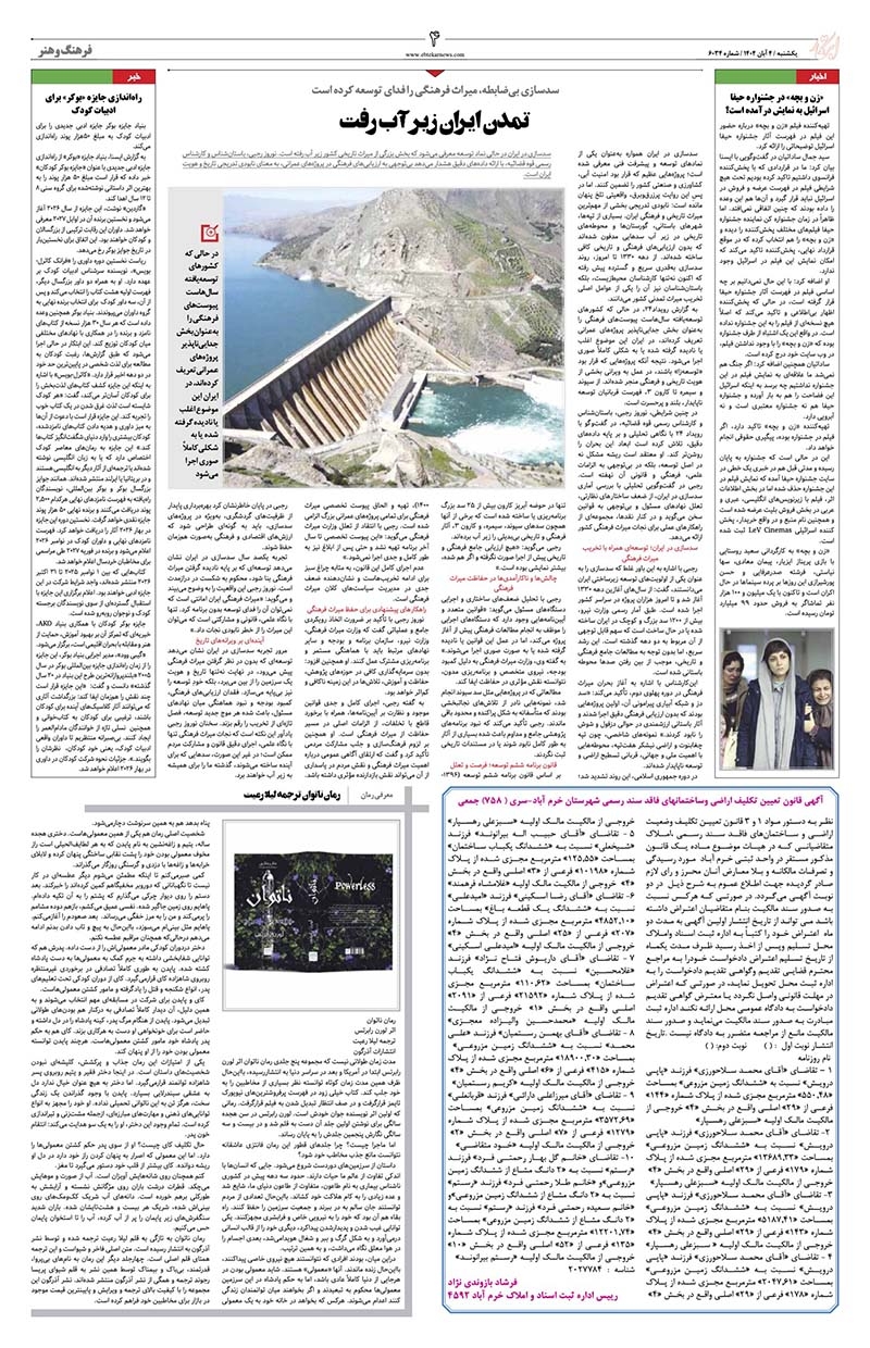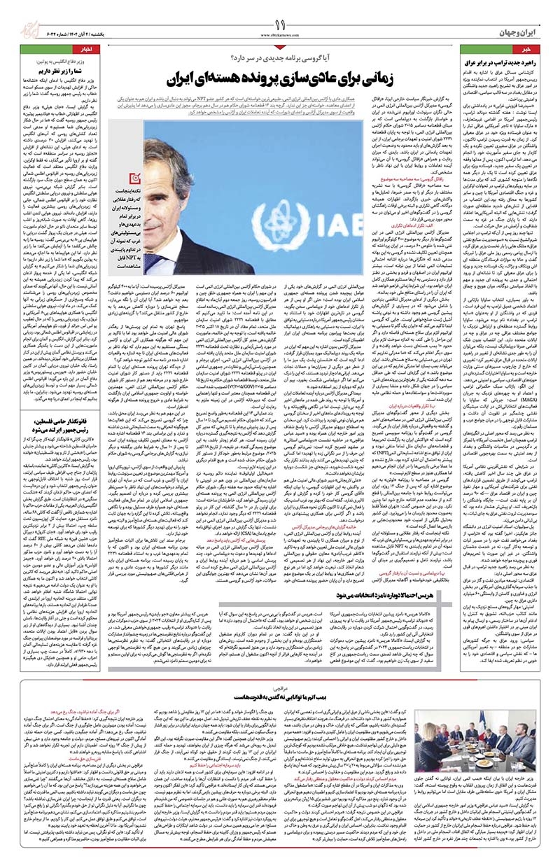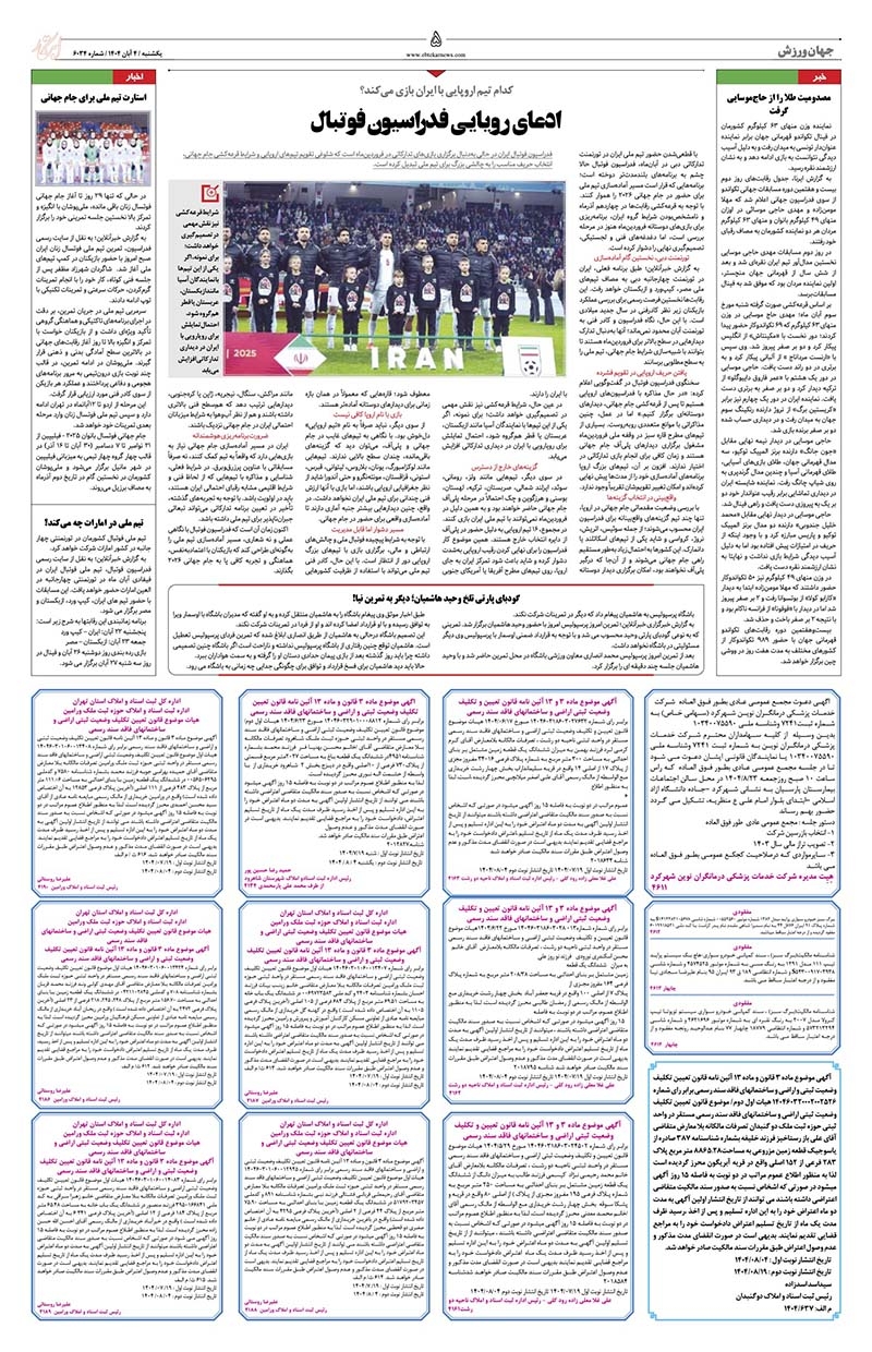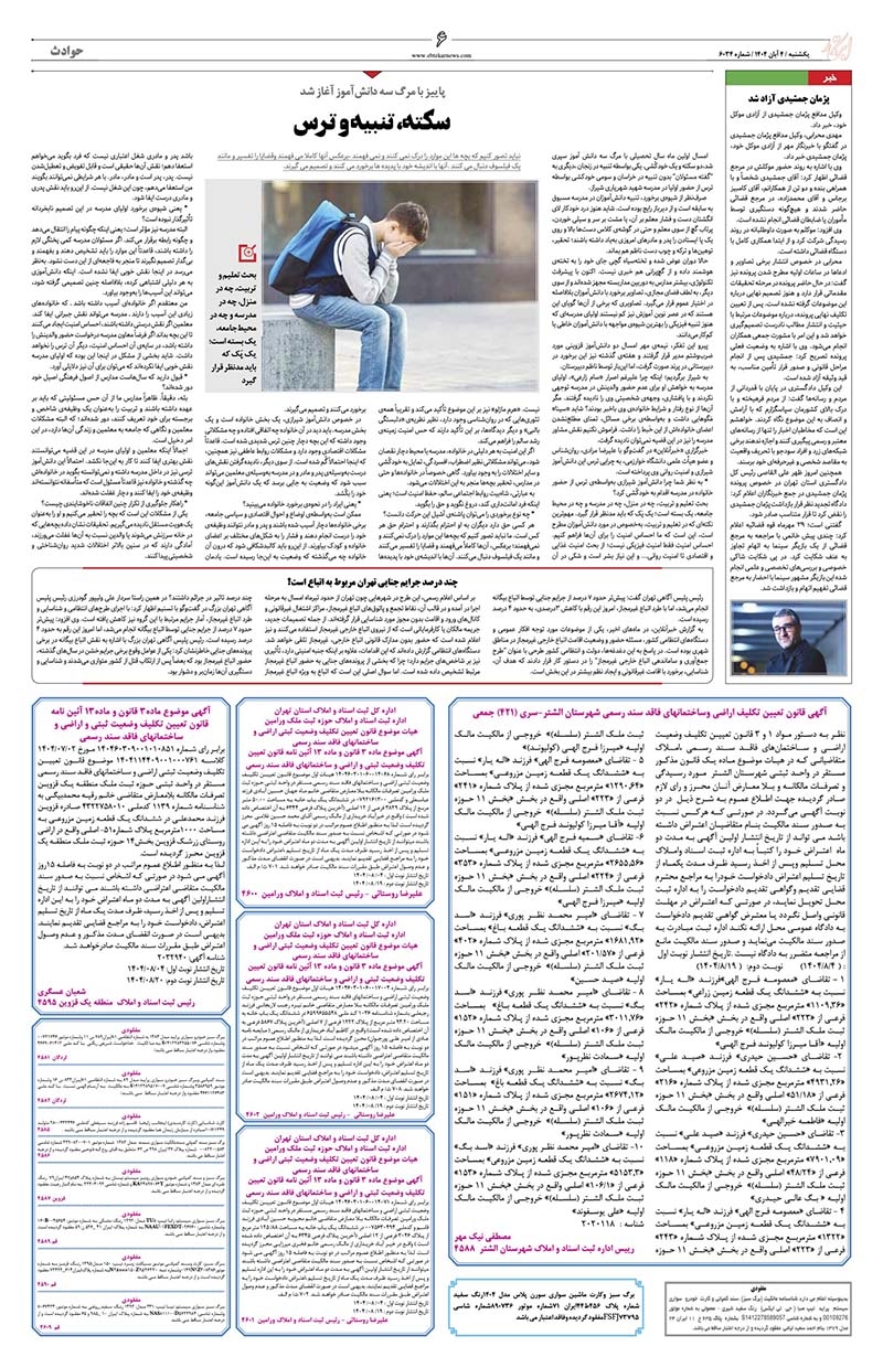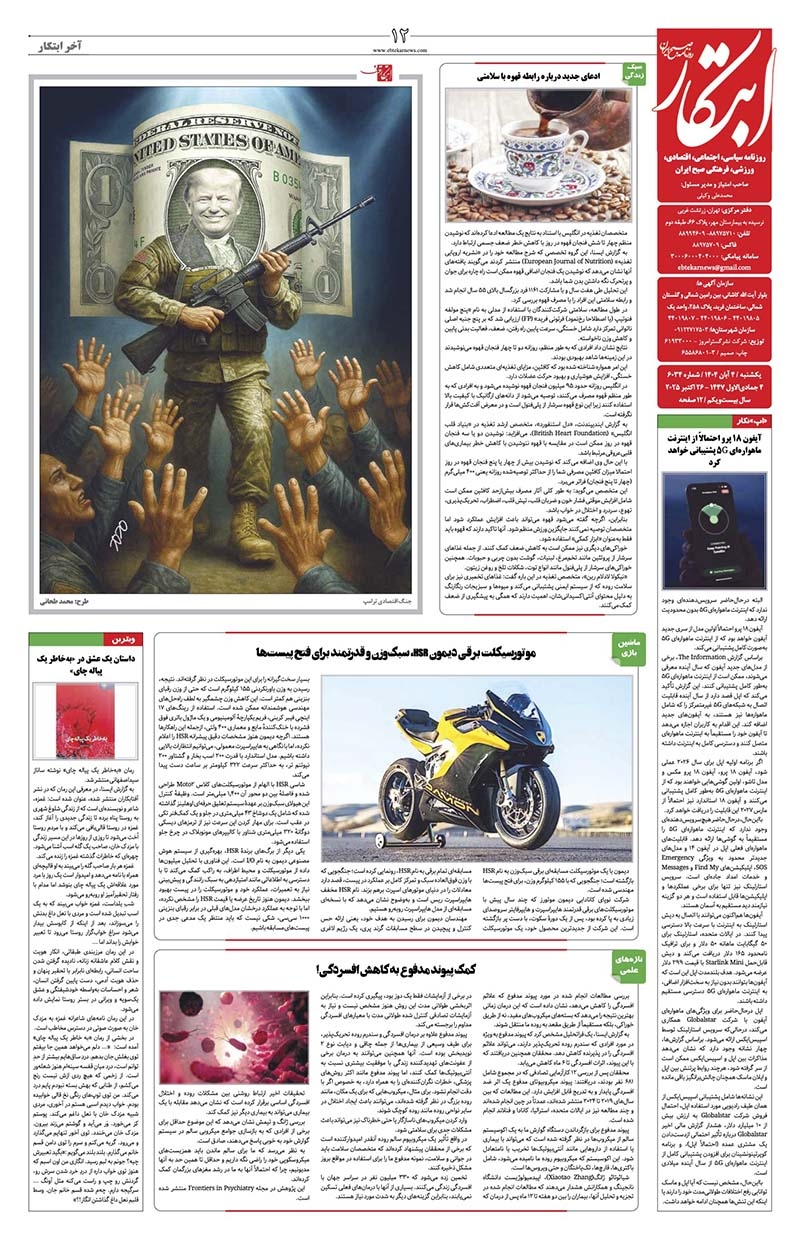 صفحه ۱ صفحه آخر صفحه ۱۱ | ایران و جهان صفحه ۱۰ | آگهی صفحه ۹ | تولید و تجارت صفحه ۸ | بازار و سرمایه صفحه ۶ | حوادث صفحه ۵ | جهان ورزش صفحه ۴ | فرهنگ و هنر صفحه ۳ | جامعه صفحه ۲ | سیاست روز