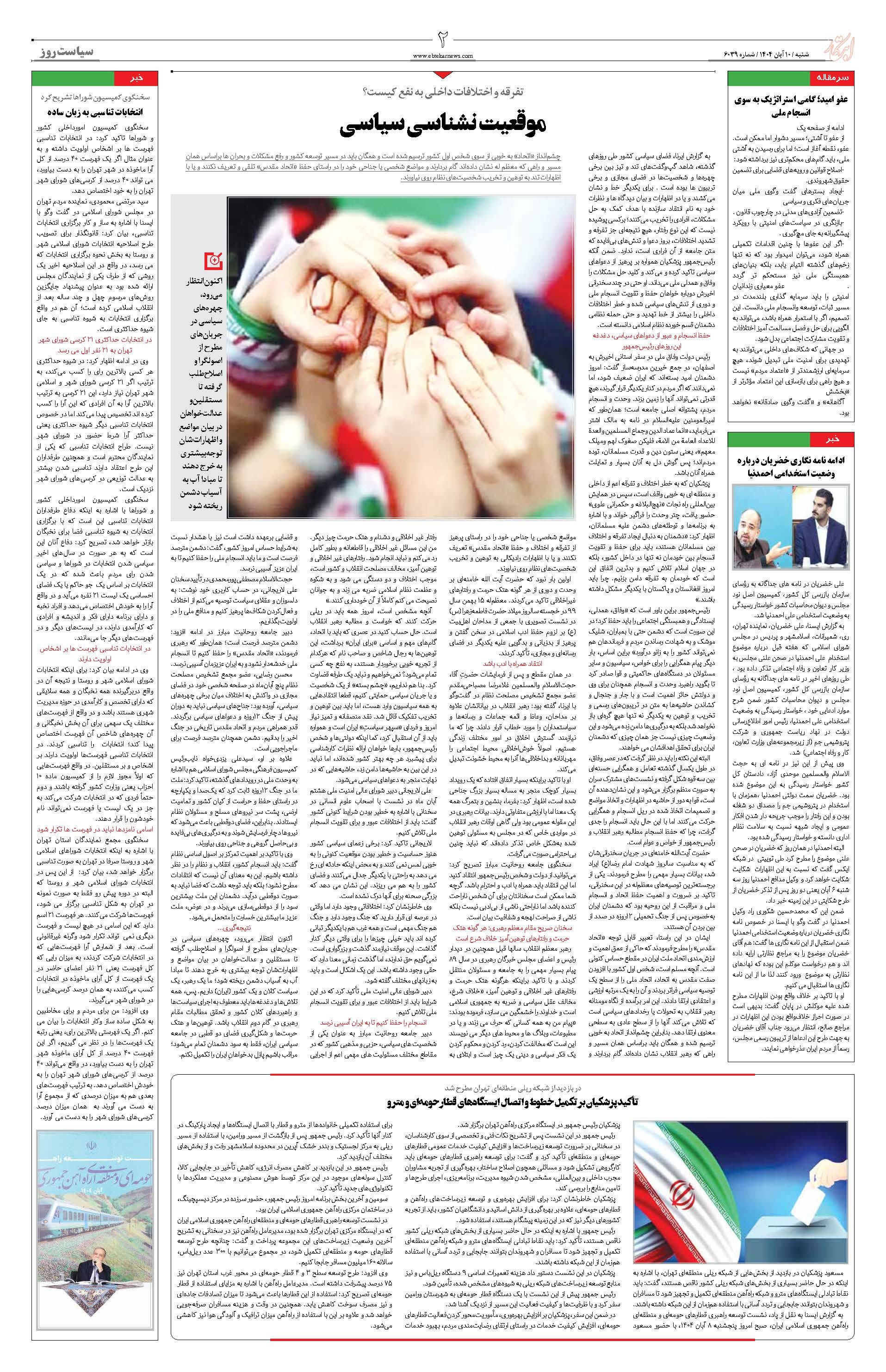 موقعیت نشناسی سیاسی انتخابات تناسبی به زبان ساده تأکید پزشکیان بر تکمیل خطوط و اتصال ایستگاههای قطار حومهای و مترو ادامه نامه نگاری خضریان درباره وضعیت استخدامی احمدنیا