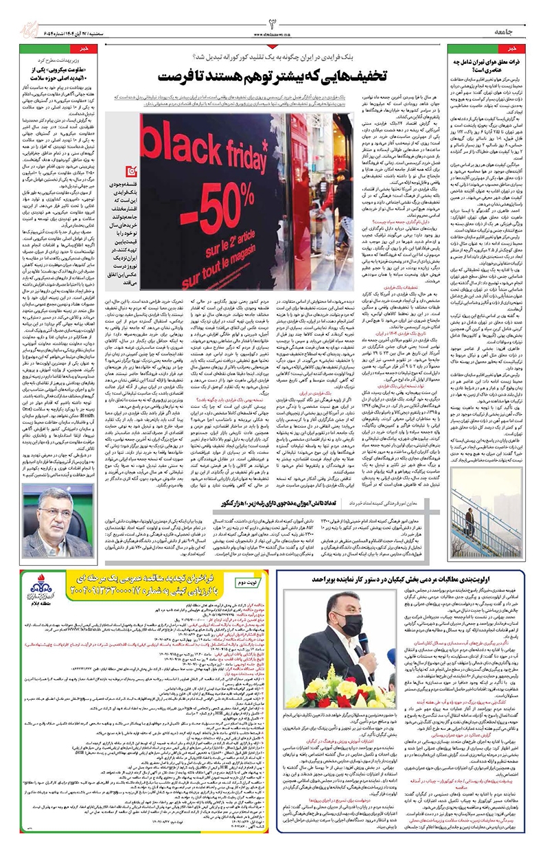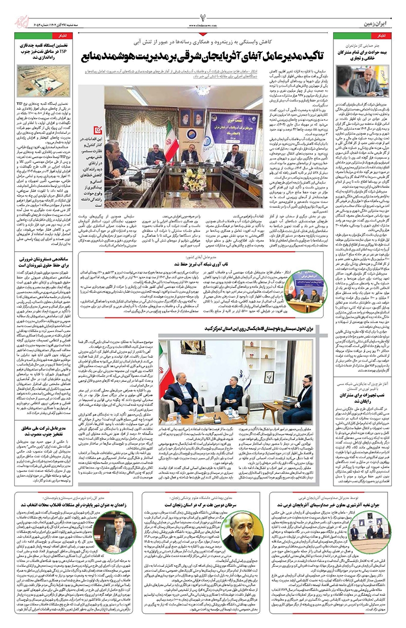 تاکید مدیرعامل آبفای آذربایجان شرقی بر مدیریت هوشمند منابع تاب آوری شبکه آب تبریز حفظ شد برای تحول سیستان و بلوچستان فقط یکسال روی این استان تمرکز کنید جوان نخبه آذرشهری معاون خبر صداوسیمای آذربایجان غربی شد سرطان دومین علت مرگ در استان زنجان است زاهدان به عنوان شهر پایلوت رفع مشکلات فاضلاب محلات انتخاب شد بیمه حوادث برای تمام مشترکان خانگی و تجاری نصب تجهیزات برای مشترکان رایگان شد نخستین ایستگاه تلمبه چندفازی TSP در مناطق نفتخیز جنوب راهاندازی شد ساماندهی دستفروشان ضرورتی برای حفظ حقوق شهروندان است مدیرعامل شركت ملی مناطق نفتخیز جنوب منصوب شد