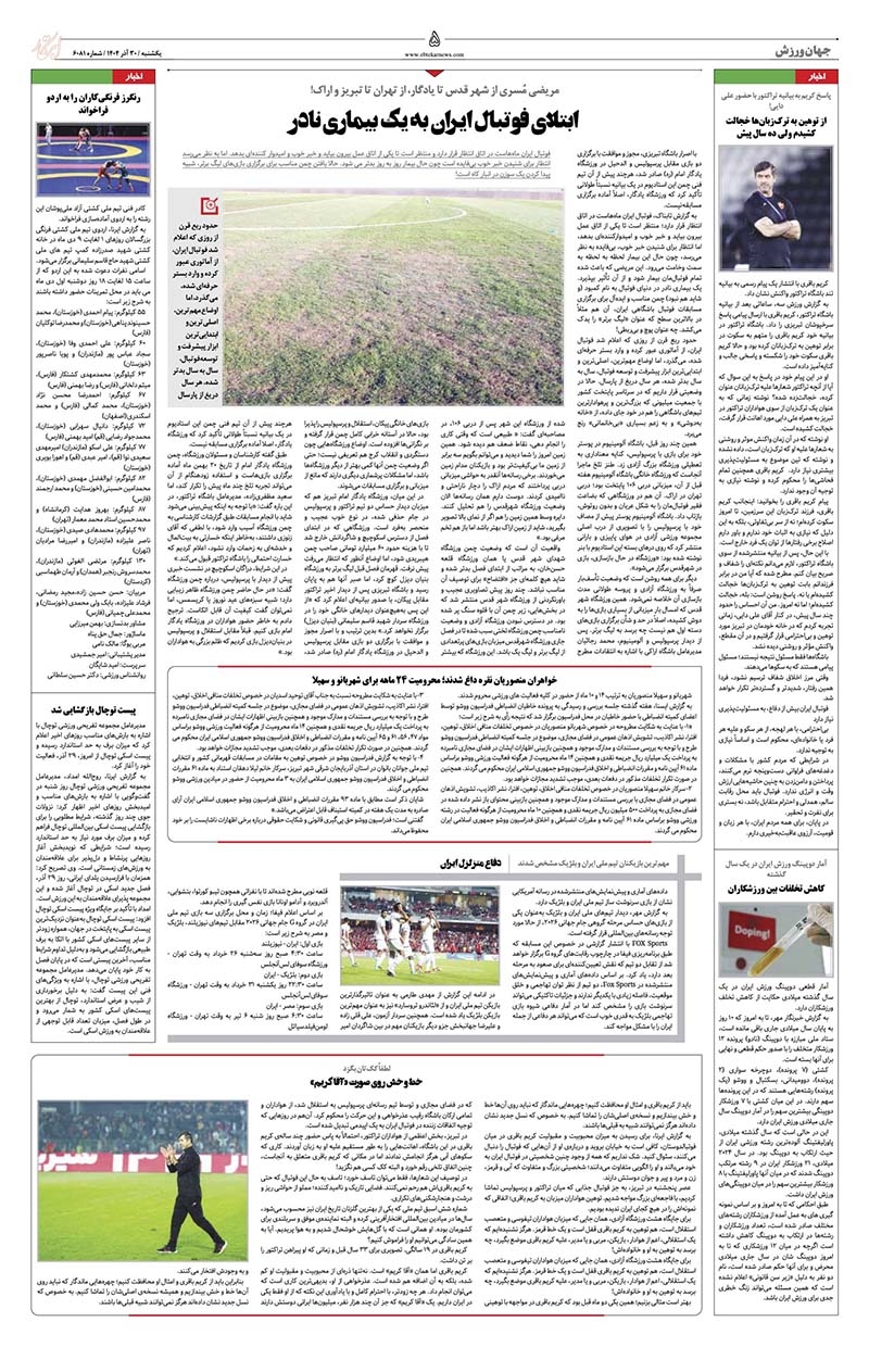 ابتلای فوتبال ایران به یک بیماری نادر خواهران منصوریان نقره داغ شدند؛ محرومیت ۲۴ ماهه برای شهربانو و سهیلا دفاع متزلزل ایران خط و خش روی صورت «آقا کریم» از توهین به ترکزبانها خجالت کشیدم ولی ده سال پیش کاهش تخلفات بین ورزشکاران رنگرز فرنگیکاران را به اردو فراخواند پیست توچال بازگشایی شد