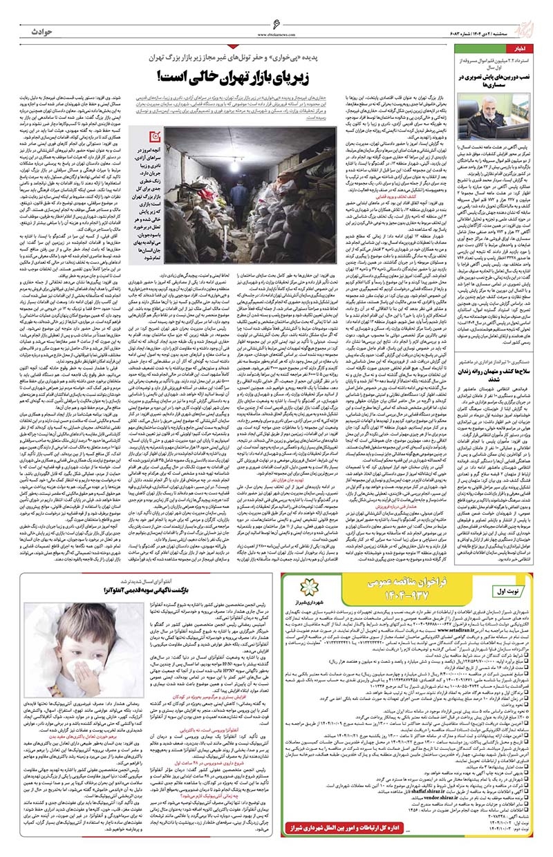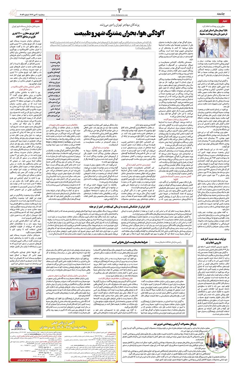 آلودگی هوا، بحران مشترک شهر و طبیعت گذار ایران از خشکسالی شدید به ترسالی کمسابقه در کمتر از دو هفته شرایط محیطزیست ایران بحرانی است پروتکلِ محصولات آرایشی و بهداشتی تدوین شد ۱۵۸ بیمارستان استان تهران زیر ذرهبین بازرسان بهداشت محیط جزئیات نسخه جدید آمارنامه دارویی اعلام شد آغاز توزیع مخازن ۱۱۰۰ لیتری فلزی درمناطق۲۲گانه