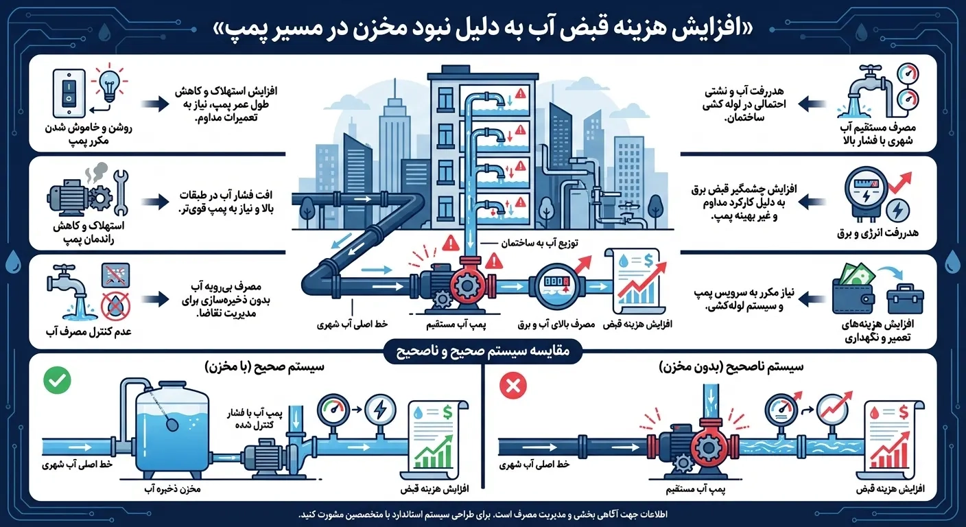در نبود مخزن آب، پمپ بهجای کارکرد در بازههای منطقی و ذخیره آب در حجم مشخص، مجبور است بهصورت لحظهای و مکرر روشن و خاموش شود. این وضعیت نهتنها باعث افزایش استهلاک پمپ و تجهیزات جانبی میشود، بلکه آب با دبی بالا و بدون مدیریت وارد لولهکشی ساختمان شده و زمینه هدررفت پنهان آب را فراهم میکند.